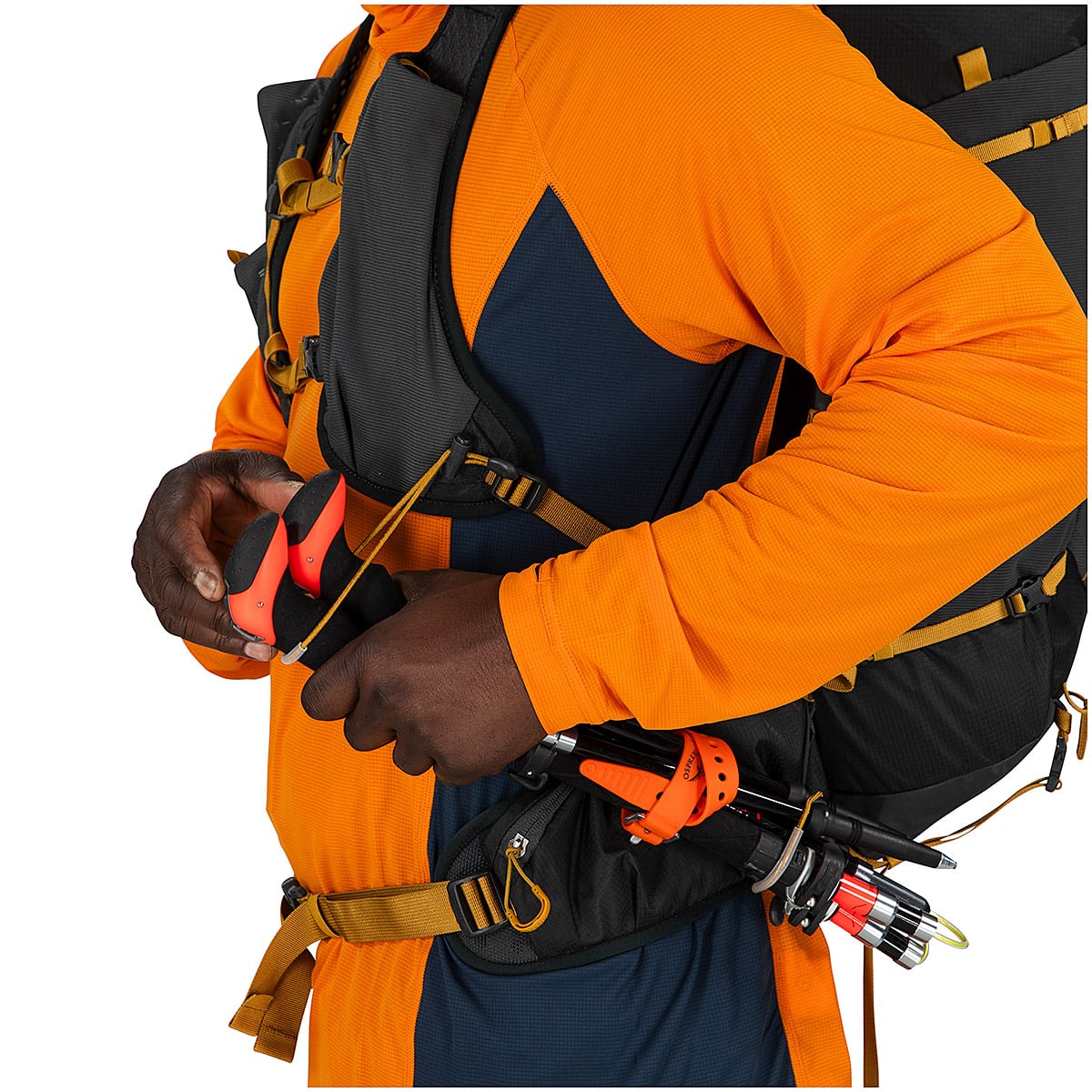 背面には運搬時の安定性と適度な通気性に優れるエアスケープバックパネルを採用。面ファスナーによる最大10cmの背面長調整が可能なほか、ロードリフターも備えており、荷重に合わせてフィットの微調整が可能です。バックパネルとシームレスに一体化された、柔軟性のあるヒップベルトが腰を包み込み、アクティブな身体の動きに対応します。