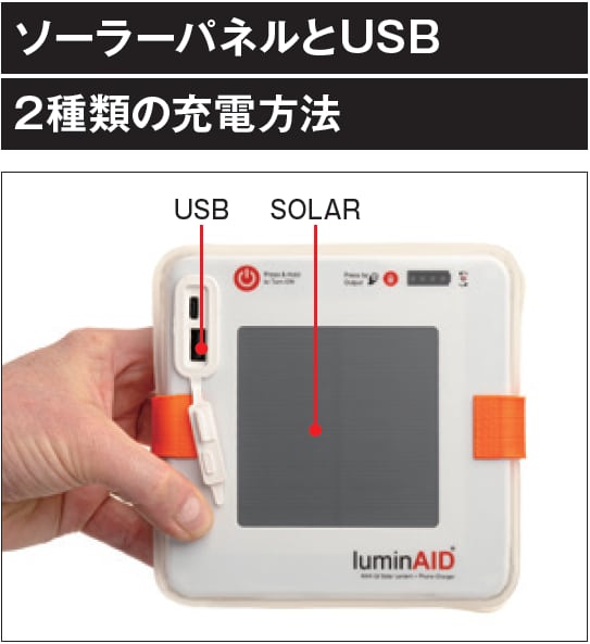 ・ソーラーパネルとUSB端子の2種類の充電方式