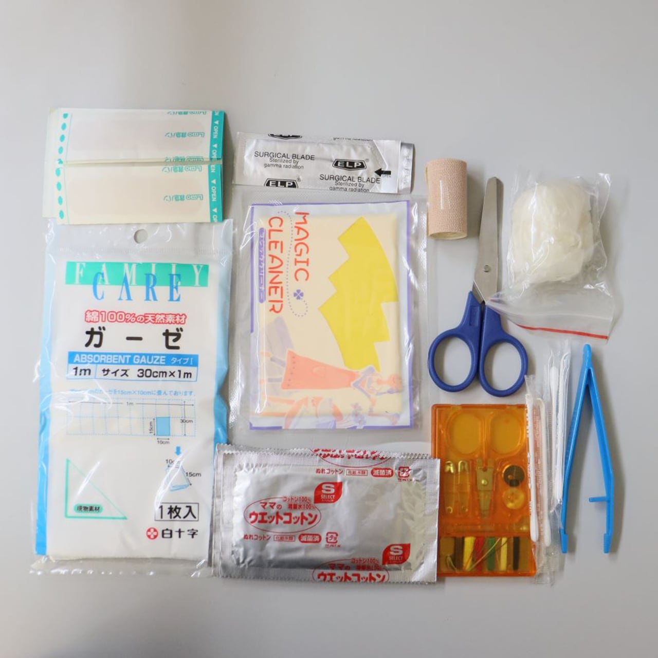■内容:ガーゼ、綿棒(5 本)、ウェットコットン(3 枚)、乾燥スポンジ、ハサミ、裁縫セット、絆創膏(10 枚)、ピンセット、手袋(2 枚)、カッターブレード、キネシオロジーテープ、アクセサリーカラビナ、キャリングケース