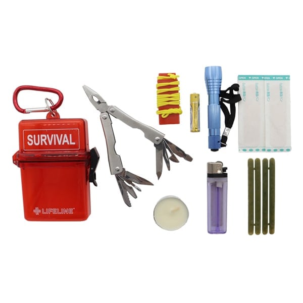 内容物:防水ケース、アクセサリーカラビナ、防滴フラッシュライト(単4電池1本付属)、マルチツール、フリント式ライター、着火剤(4本)、キャンドル、ホイッスル、絆創膏(5枚)