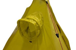 素材には日本製高強度10Dナイロンリップストップ透湿PU<2G>コートを採用し、シームシーリング済です。 前後にある出入口は2本のファスナーを逆L字に配置しているので大きく解放します。縦ファスナーは上からも開くので、リング芯内蔵のベンチレーターと連動し効果的な換気が可能です。