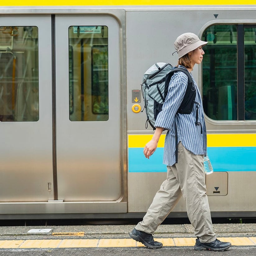 メイン開口部は止水ジッパーを採用し、身体側に大きく開くクイックアクセス構造。電車移動時や山での休憩時にも荷物の出し入れがしやすく、日常とアウトドアの両方で使いやすい設計です。