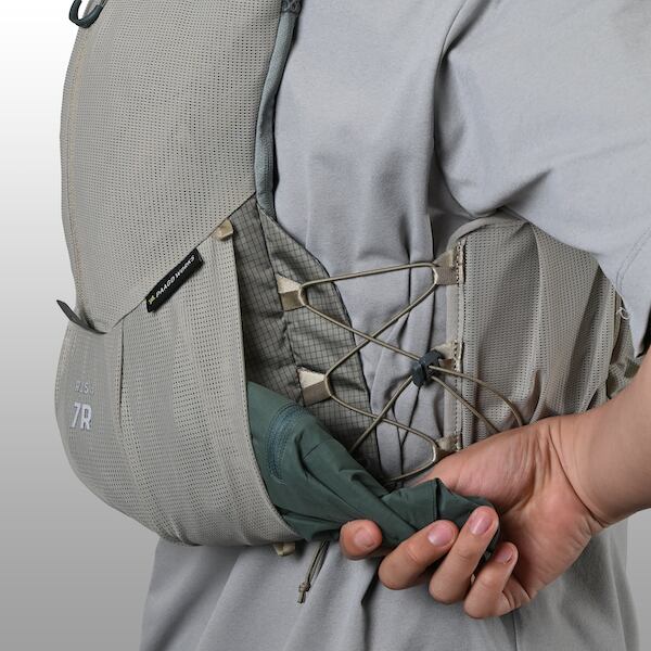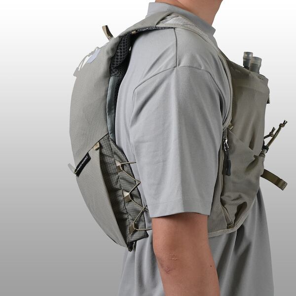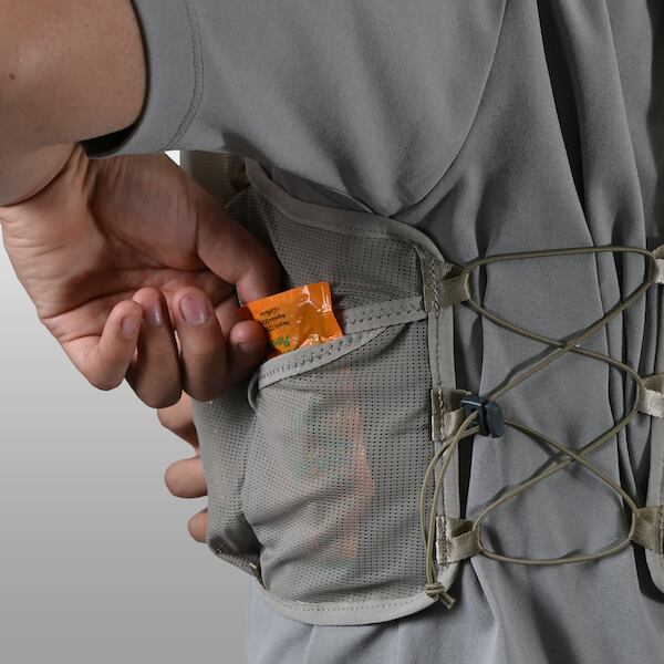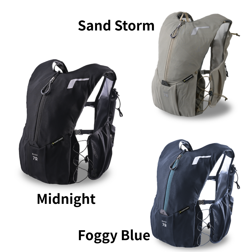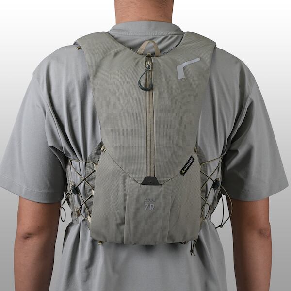 継続モデルの中でも最もアップデートされたRUSH 7R。ベースボディはそのままに、体に触れる部分を通気性の高いモノメッシュへ変更し、快適性が向上しています。同シリーズの11Rや3R同様、サイドは6点式バンジーコードを採用し、片手で直感的なフィット調整が可能に。チェストストラップやポケット配置も見直され、アクセス性・操作性もアップ。〜70kmクラスのトレランレースや日々のトレーニングにちょうどいい容量です。