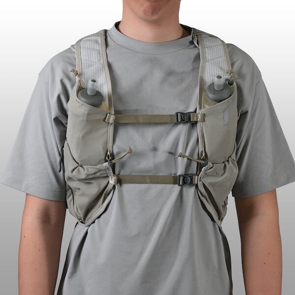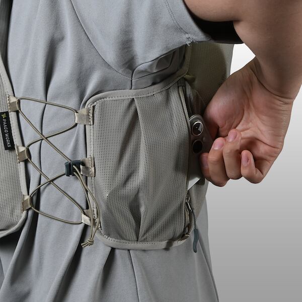 ボトルポケットは、600mlまでのソフトフラスクと500mlのペットボトルに最適化。ドローコードで脱落を防止します。右胸には緊急時用のホイッスル付きです。