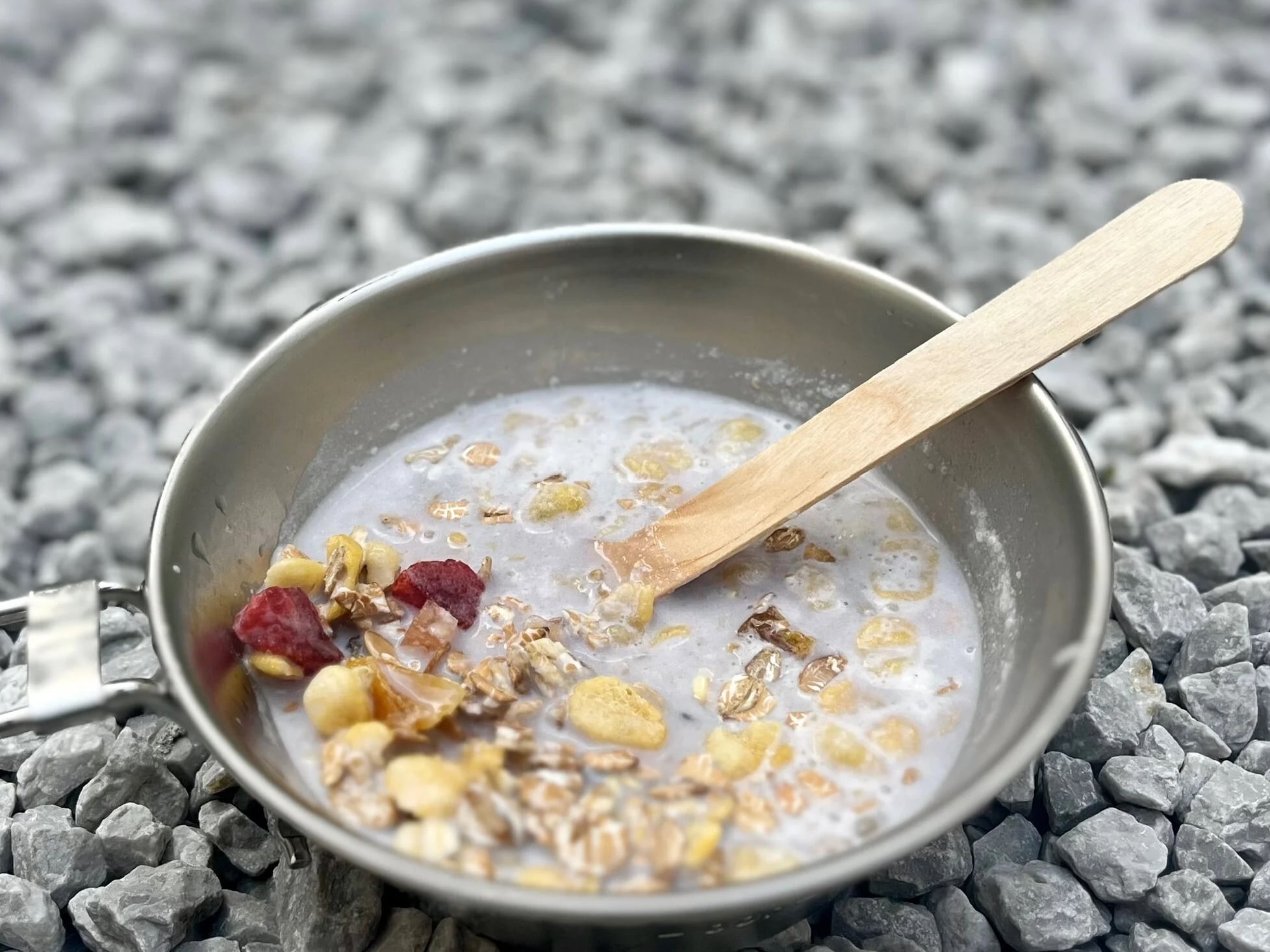 水だけで手軽に食べられるオーガニックグラノーラ。1人前を2つの袋に分け、こまめな摂取ができるようにしました。たった100ccという少量の水で食べられるのも嬉しい。