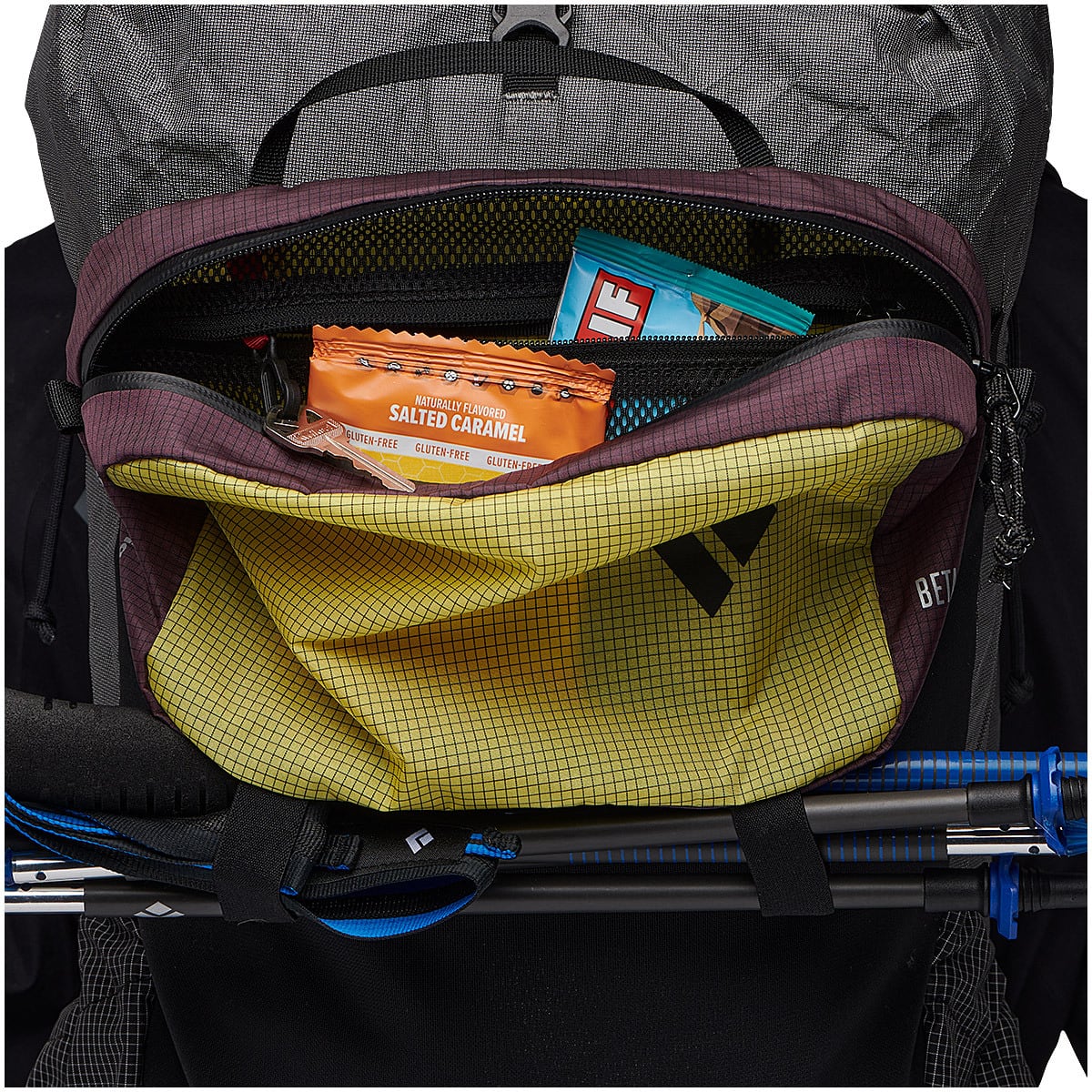 ベータライトの容量を4リットル拡張できる外付けバッグ。チェストストラップもしくは正面メッシュポケットにワイヤークリップで装着します。ベータライト本体のヒップベルトに固定して、または単体でウェストバッグとしても活用できます。