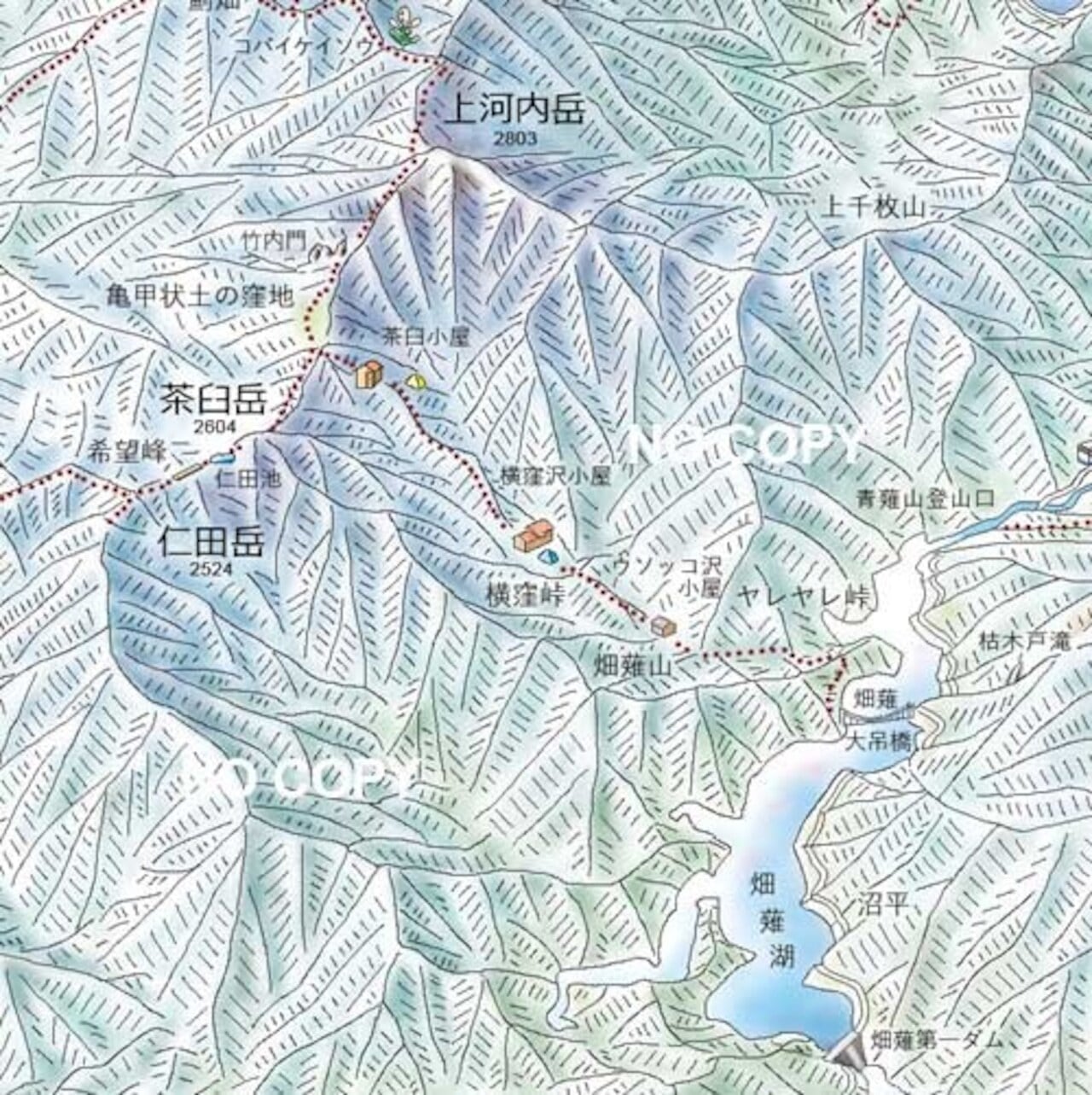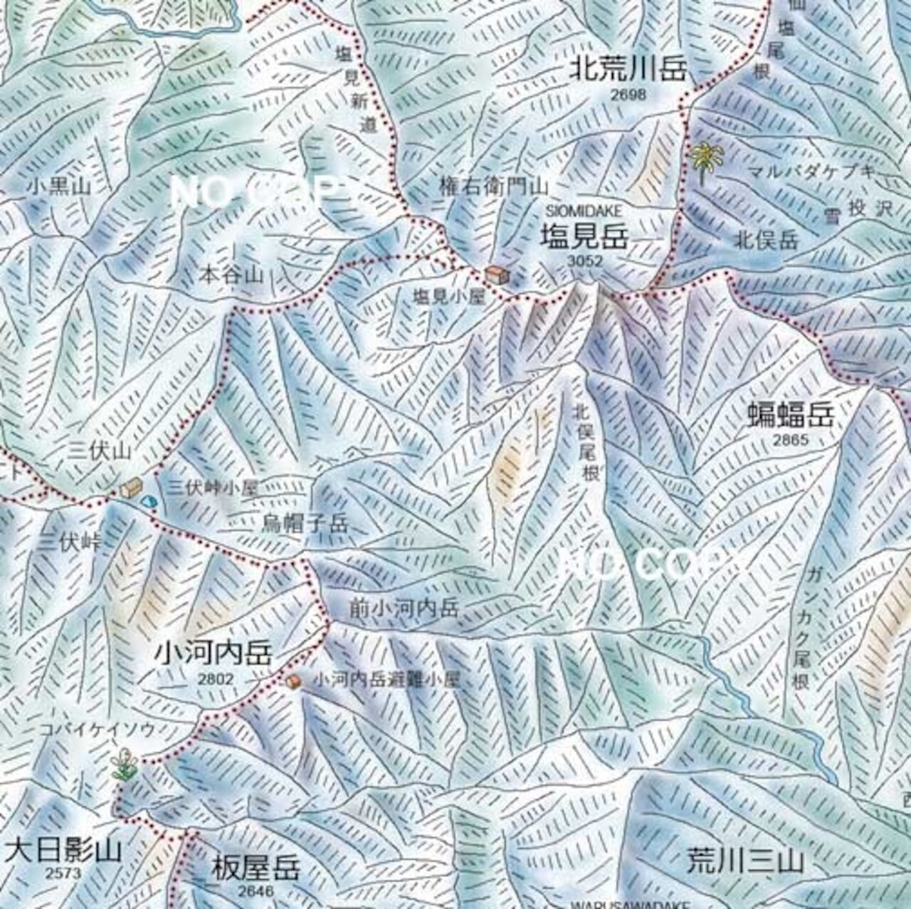 少し離れて眺めれば南アルプスの概観が手に取るようにわかります。また、細かい部分に目を向ければ、歩いたことのある登山道や泊まったことのある山小屋、テント場や花の群生地など、縦走の記憶が蘇ります。