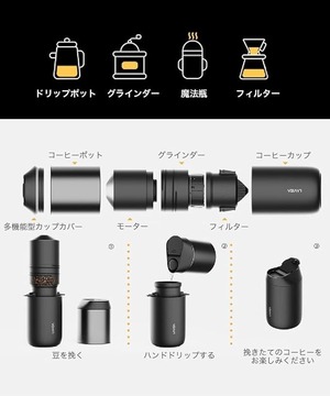●同梱物:本体、掃除用ブラシ、計量カップ、充電用USBケーブル、取扱説明書、コーヒー豆ケース